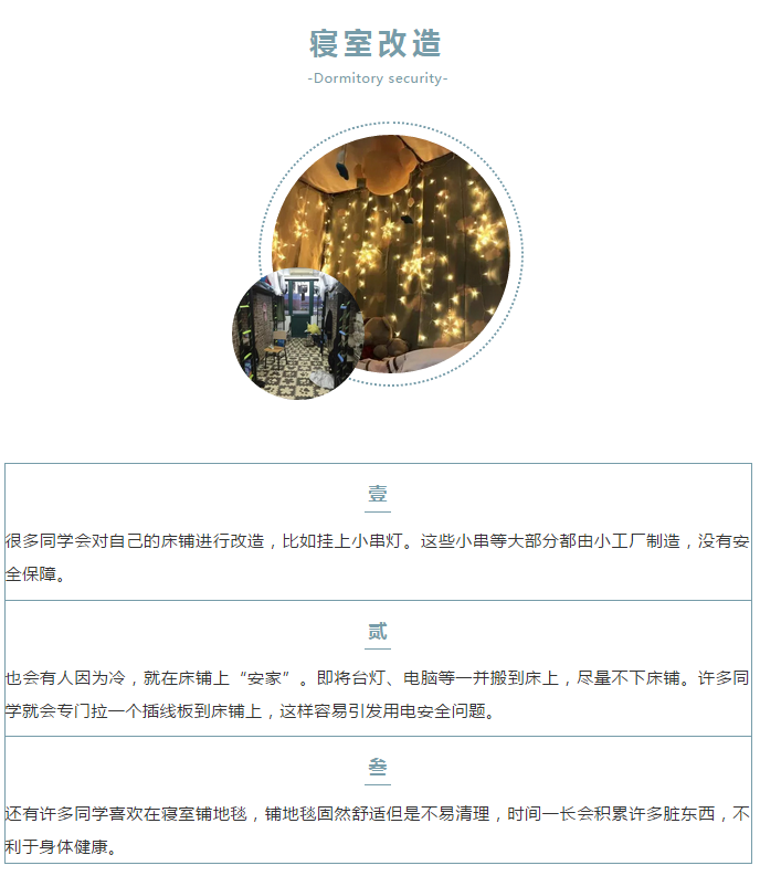 秋冬季节天气寒冷干燥,是火灾的多发季节。在这里要提醒各位同学们一定要注意宿舍安全。宿舍是我们共同的家,安全则是这个家的重中之重。